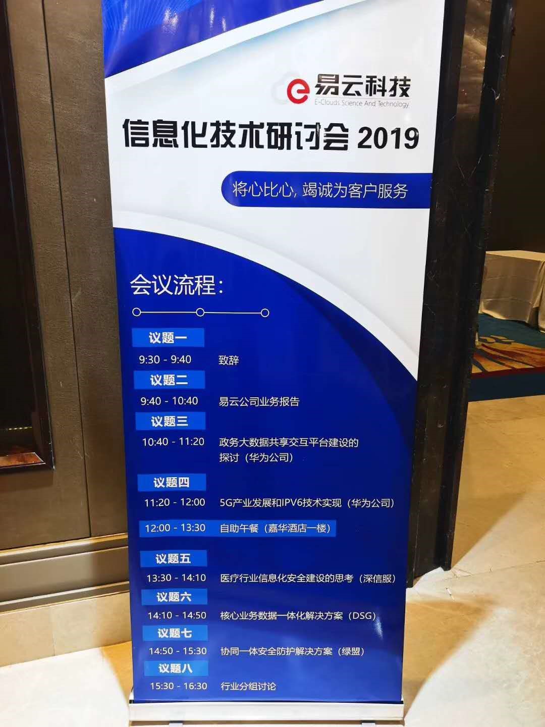 2019年11月30日,易云公司在淮安市萬達嘉華酒店成功舉辦2019年技術研討會,會議邀請了淮安市工信局、大數(shù)據(jù)局等單位領導與會致辭,并邀請了淮安市政府、高校、醫(yī)療、企業(yè)等行業(yè)100余位用戶,就大數(shù)據(jù)應用、等保2.0、網(wǎng)絡安全、IPV6等主題進行了交流探討。會議還邀請了華為公司、深信服公司、綠盟公司等眾多合作伙伴與會專題報告交流。