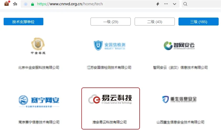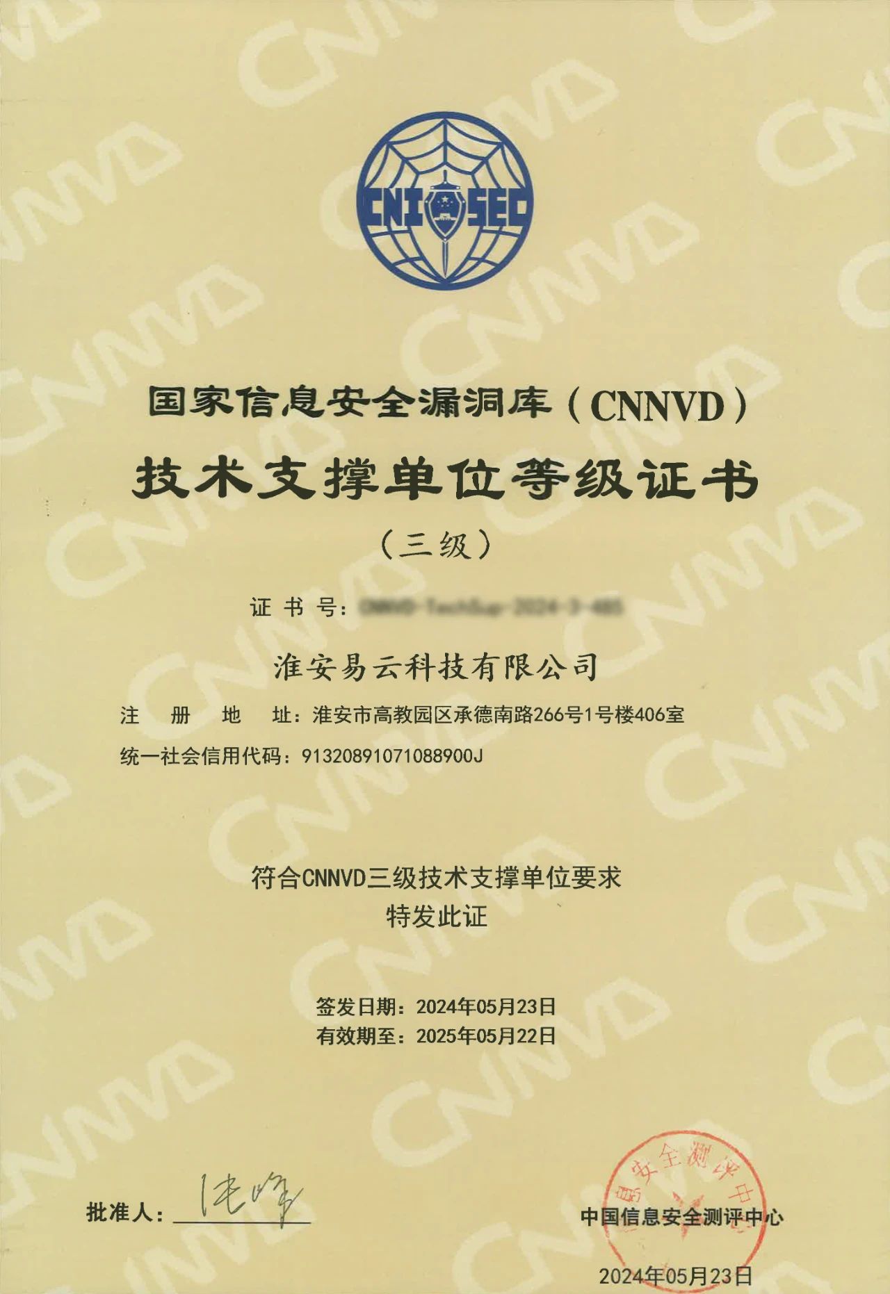 近日,國家信息安全漏洞庫(CNNVD)公示新增技術(shù)支撐單位名單,淮安易云科技有限公司榮獲《國家信息安全漏洞庫(CNNVD)技術(shù)支撐單位等級證書》。